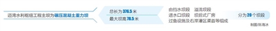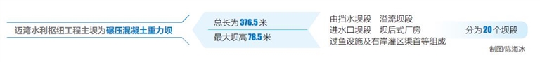 据悉,迈湾水利枢纽工程主坝为碾压混凝土重力坝,总长为376.5米,最大坝高78.5米,由挡水坝段、溢流坝段、进水口坝段、坝后式厂房、过鱼设施及右岸灌区渠首等组成,分为20个坝段。