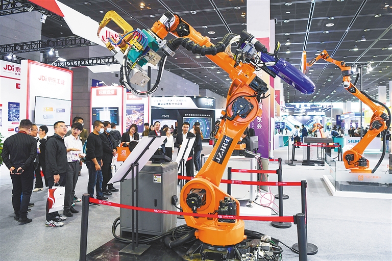 10月21日在2023世界物联网博览会活动现场拍摄的智能机器人工作站。