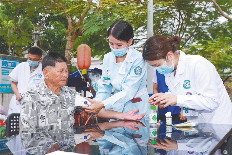 10月21日,由万宁市多部门组织开展的2023“重阳敬老·党员先行”活动走进万宁市龙滚镇敬老院,党员志愿者为老年人送去温暖和关爱。图为万宁市人民医院医生为老人测血压。