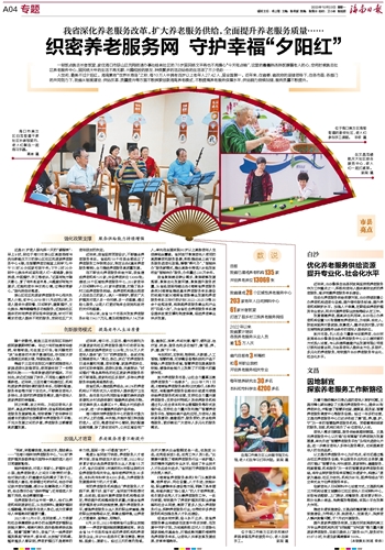 人世间,最美不过夕阳红。海南素有“世界长寿岛”之称,每10万人中拥有百岁以上老年人27.42人,居全国第一。近年来,在省委、省政府的坚强领导下,在各市县、各部门的共同努力下,我省从制度建设、供给改革、质量提升等方面不断探索创新海南养老模式,不断提高养老服务保障水平,供给能力持续加强,服务质量不断提升。