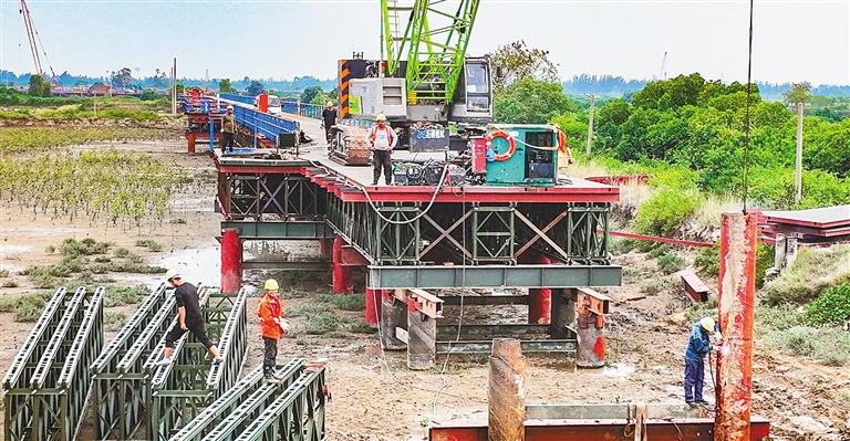 近日,海南环岛旅游公路项目环新英湾支线北门江特大桥项目有序推进,目前该项目正在加紧进行桥墩等部位施工。