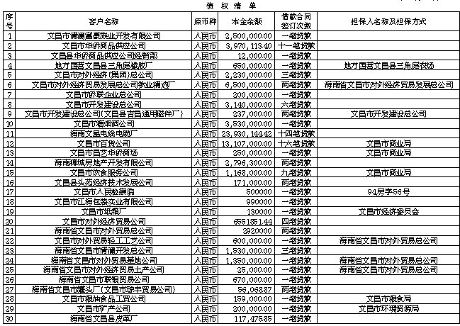 东方保利达资产管理有限公司、中国信达资产管理公司(海口)办事处、文昌俊利发实业有限公司已将下列《债权清单》所列的对借款人贷款债权截止至2009年12月20日(含附属担保权益)本金余额及相应的欠付利息作为上述不良资产组合的组成部分,分别于2009年3月31日、2009年6月29日、2009年10月10日转让给海南文昌发展控股集团有限公司(原文昌市城市建设投资有限公司)。借款人至今尚欠下本金及相关利息、罚息(利息、罚息未列出),我公司特此对有关债权及附属权益予以催收。借款人(主债务人)及担保人在本公告见报后,应派人与我公司核对有关内容,并尽快组织资金归还所欠款项。否则,我公司将依法采取相应措施予以追索(若债务人、担保人因各种原因更名、改制、歇业、吊销营业执照或丧失民事主体资格的,请相关承债主体及/或主管部门代为履行义务或履行清算责任)。特此公告