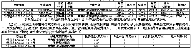 以上控制指标按规定列入《产业项目发展和用地准入协议》,竞得人须与乐东黎族自治县发展和改革委员会签订《海南省产业项目发展和用地准入协议》。并严格按照协议约定内容进行开发建设,否则将承担相关违约责任。(二)其他开发建设要求:1.竞得人自取得土地使用权之日起一年内动工开发建设,自开发建设之日起三年内完成项目建设;须严格按照规划部门批准的规划设计要求进行开发建设;如造成土地闲置,按照《海南自由贸易港闲置土地处置若干规定》执行。2.地块采用装配式建筑方式建造。3.如不按批准的规划设计要求进行开发建设及不履行《国有建设用地使用权出让合同》约定的,报经县人民政府批准,无偿收回土地使用权。4.竞得人在签订《产业项目发展和用地准入协议》后,竞得人出资比例结构、项目公司股权结构未经土地所在地人民政府批准不得发生变动。四、竞买申请:(一)中华人民共和国境内外的公司、企业、其他组织及自然人均可参加竞买,法律、法规另有规定的除外。属境外法人或其他组织的,须提供境外公证部门的公证书。1.申请人须具备竞买条件,并按规定交纳竞买保证金,我局将在规定的时间内确认其资格,签发资格确认书。2.对发现并核实竞买人存在下列情形之一的,不得申请参加挂牌出让活动:(1)存在伪造公文骗取用地和非法倒卖土地等犯罪行为的;(2)存在非法转让土地使用权等违法行为的;(3)在乐东县内其他区域内取得土地使用权,但因企业原因造成土地闲置一年以上的;(4)开发建设企业违背出让合同约定条件开发利用土地的;(5)存在重大税收违法行为的;(6)失信被执行人。3.申请人拟成立项目公司或全资子公司进行开发建设的,应在竞买申请书中明确全资子公司成立时间等内容,由全资子公司与乐东县自然资源和规划局签订《国有建设用地使用权出让合同》,办理土地使用权登记手续。(二)交易资料获取方式。本次挂牌出让的详细信息和具体要求,见挂牌出让手册及其他相关文件。手册和文件可从海南省建设用地使用权和矿业权网上交易系统(以下简称网上交易系统,网址:http://lr.hainan.gov.cn:9002)查看和打印。(三)竞买申请方式。有意向的竞买人可登录网上交易系统提交竞买申请,按要求上传竞买申请文件。本次交易不接受电话、邮寄、书面、口头等其他形式的申请。竞买申请时间:2023年10月23日8时00分至2023年11月21日17时00分(以网上交易系统服务器时间为准,下同)。(四)竞买保证金。竞买人在网上交易系统提交竞买申请时,须按照挂牌出让手册的有关规定足额缴存竞买保证金或使用银行保函方式提供竞买保证金。缴存竞买保证金的,应在网上交易系统上选定一家银行,系统将自动生成唯一的随机竞买保证金账号,保证金缴存银行一经选定不能更改,保证金到账时间以银行信息系统入账时间为准;缴存的竞买保证金币种为人民币,不接受外币,且不属于银行贷款、股东借款、转贷和募集资金所得,并出具承诺。使用银行保函方式提供土地竞买保证金的,竞买人应向银行申请开立《土地竞买保证金保函》,纸质保函由银行将原件密封后直接指定专人送达或通过邮政特快专递寄送给出让人指定地点由指定联系人签收,需在竞买保证金到账截止时间前2个工作日送达。竞买人应审慎注意。竞买保证金到账截止时间为:2023年11月21日17时00分。(五)资格确认。竞买资格审核开始后,出让人在2个工作日内、资格审核截止时间前完成竞买申请文件审核。竞买人提交竞买申请时应充分考虑网上交易活动的竞买资格审核时效,并进行审慎注意。竞买人的竞买申请文件审核通过,且竞买保证金已按要求交纳的,网上交易系统自动发放《竞买资格确认书》,确认其获得竞买资格。竞买资格审核时间:2023年10月23日08时00分至2023年11月21日17时30分。五、挂牌报价时间及网址:(一)挂牌报价开始时间:2023年11月13日08时30分。(二)挂牌报价截止时间:乐东县Ln2023-11-3号地块:2023年11月23日10时00分;乐东县Ln2023-11-4号地块:2023年11月23日10时00分;乐东县Ln2023-11-5号地块:2023年11月23日10时00分。(二)挂牌网址:海南省建设用地使用权和矿业权网上交易系统(http://lr.hainan.gov.cn:9002/)。(三)网上挂牌报价时间截止时,无竞买人报价,挂牌活动自动结束;有竞买人报价,网上交易系统限时5分钟在线询问,有竞买人在此规定时限内表示愿意参与网上限时竞价的,系统自动进入网上限时竞价程序,以竞价方式确定竞得人。六、其他需要公告的事项:(一)竞买人竞得土地使用权后应与出让方和挂牌人签订《成交确认书》,并在10个工作日内与乐东黎族自治县自然资源和规划局签订《国有建设用地使用权出让合同》。并按出让合同约定的期限30日内付清土地成交总价款(成交价款不含各种税费)。竞得人付清全部挂牌出让成交价款及各种税费后,依法申请办理土地登记,领取《不动产权证》。在办理《不动产权证》的过程中所产生的相关税费由竞得人自行按规定缴交(双方的印花税由竞得者缴纳)。旅馆用途不能分割发证。(二)报名竞买时须缴交竞买保证金,竞得后竞买保证金转为土地出让金,按双方签订《国有建设用地使用权出让合同》约定的时间内缴完剩余出让金。(三)如不按批准的规划设计要求进行开发建设及不履行《国有建设用地使用权出让合同》约定的,报经县人民政府批准,无偿收回土