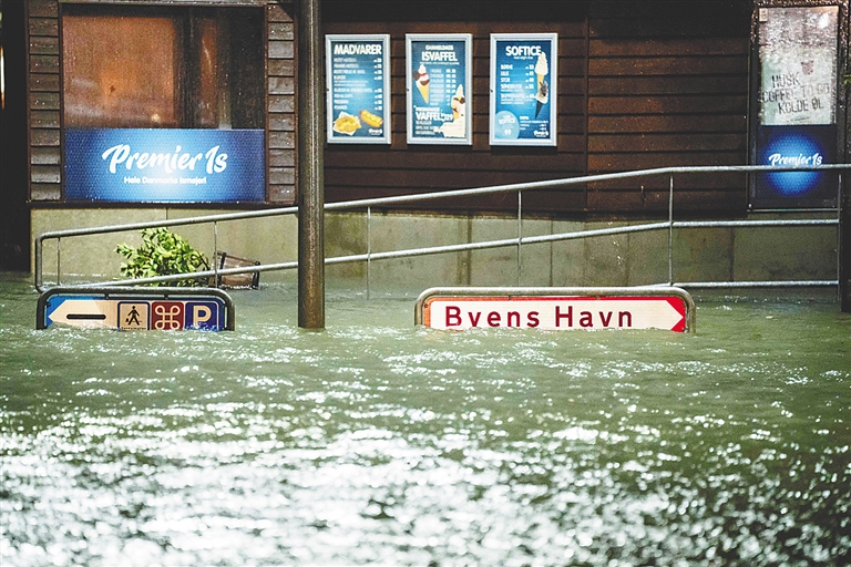图为在丹麦日德兰半岛南部拍摄的被洪水淹没的街道。新华社/法新