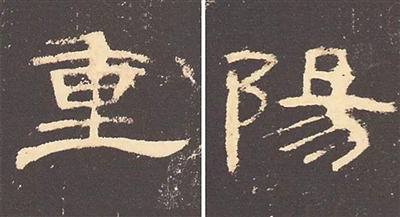 图9的“重阳”二字为隶书,出自汉代的《曹全碑》。《曹全碑》是汉隶的代表之一,整体秀美工整。此二字,笔画的起笔收笔均为圆笔,“重”字中宫紧凑,上紧下松,底横主笔突出,舒展优美。“阳”字布白匀称,工整稳定。两字有妍媚秀丽之艺术风格。