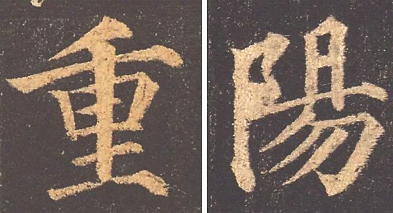 图12中的“重阳”二字为楷书,出自唐代颜真卿的《多宝塔碑》。《多宝塔碑》是颜真卿40多岁时书写的,是他书法风格初露锋芒,展现出宏伟面貌的开始之篇,典型地呈现了唐楷“尚法”的特色。此二字中锋刚劲有力,笔画饱满,力度精到,结构疏密匀称,风格严谨庄重,充满了激情和力量感。