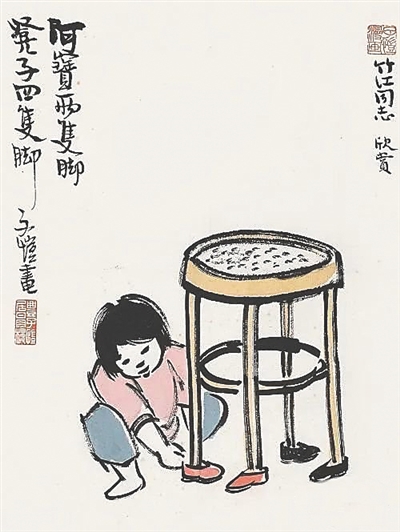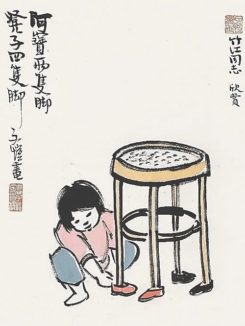 有一天,丰子恺的孩子阿宝看到凳子光秃秃的四条腿杵在地上,于是把自己和妹妹的新鞋给凳子穿上。正得意时,妈妈一边跑过来一边喊道:“软软的新鞋给你弄脏了!呀!你怎么没穿鞋子站在地上?龌龊了袜子!”这时,丰子恺连忙给妈妈使了个眼色,叫她别过去,并迅速拿起画笔记录下了这一可爱的瞬间。这就是丰子恺的代表作之一《阿宝两只脚 凳子四只脚》,简洁却又耐人寻味。孩子与生俱来的幽默感,丰子恺尽收眼底,这也成就了他漫画的幽默特质。