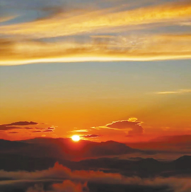 就在大家都惊诧无比以为再也见不到日出时,只见天空中那深不可测的高山峡谷里又透出了薄薄的亮光,这亮光越来越明亮,眨眼间山谷里流淌出一条金色的河流,河水红如火山喷发的岩浆。就在这河流的尽头,太阳又露出脸儿来了。此时的太阳跟之前见到的已经不一样,一会儿大如圆盘,闪着金光,一会儿小如镜子,明晃晃……