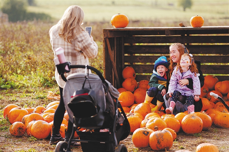 10月23日,在英国圣奥尔本斯一家农场,人们在挑选万圣节南瓜时合影。新华社/路透