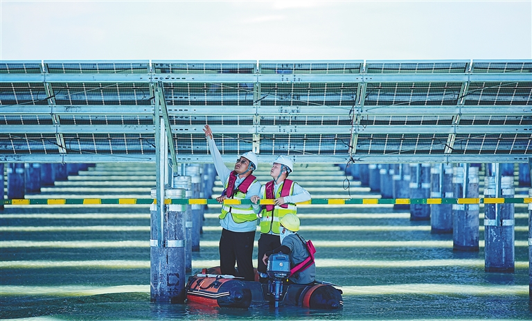 这是海南第一个盐光互补项目,如何在淤泥层7米至8米的水面上建起光伏电站?纳潮湖200兆瓦光伏项目负责人王家平说:“没有成熟经验可借鉴,一切如同摸着石头过河。”在项目施工过程中,受潮水涨落、地质条件等多重条件制约,要确保每根十余米的管桩误差控制在2厘米以内,难度极大。