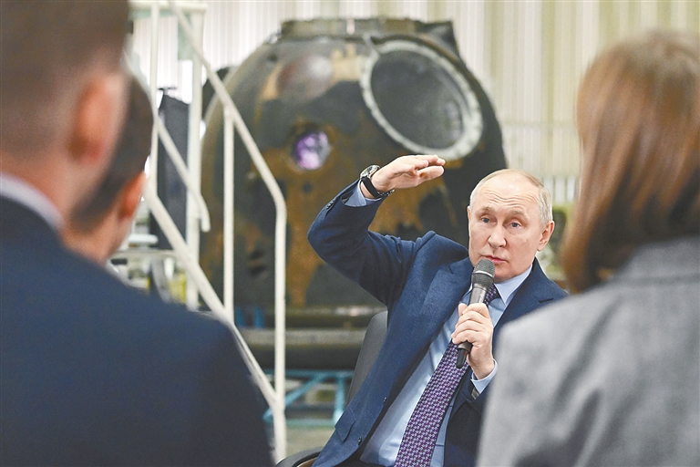 10月26日,俄罗斯总统普京在俄罗斯莫斯科附近的科罗廖夫视察一家火箭和空间技术公司时讲话。