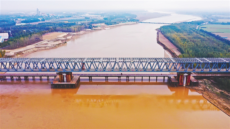 10月28日拍摄的合龙后的聊(城)泰(安)铁路黄河公铁桥。