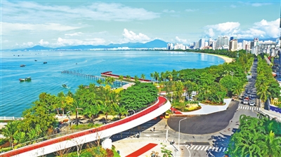 10月28日,俯瞰三亚凤凰岛桥头公园。该公园位于三亚凤凰海岸片区,目前已基本完工并对游客及市民开放。公园整体规划结构为“三道、六区、多点”,主要建设内容包括绿化工程、园路及铺装工程、园林建筑工程及配套设施等。