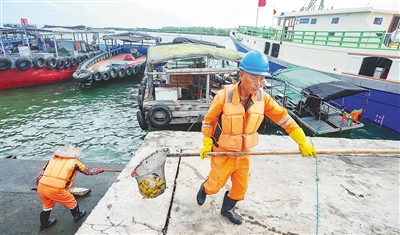 在儋州市白马井中心渔港,海岸环卫工作人员在码头打捞海上垃圾。 本版图片均由本报记者 陈元才 摄