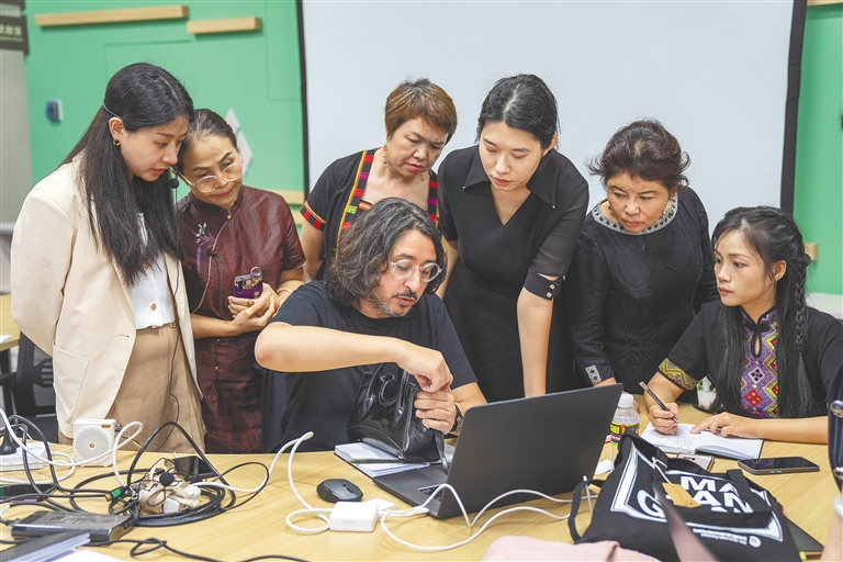 11月1日,来自意大利马兰戈尼学院的老师Alberto(前排中)在五指山市为黎锦国际化人才培养班的学员们授课。据了解,五指山黎锦国际化人才培养班于近日开班,由五指山市与意大利马兰戈尼学院深圳校区、梦之选(海南)文化传媒有限公司合作开办,旨在全方位提升海南黎锦技艺人才的文化素养和创新思维,推动海南黎锦文化走向世界。本报记者 李天平 摄