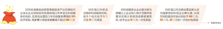 实施细则提出,海口将大力招引科技服务业企业,支持符合海南自由贸易港鼓励类产业目录的行业龙头企业和知名机构落地海口市并设立科技服务机构,实质性运营后3年内按服务费用的10%给予奖励,每家累计奖励金额最高不超过300万元。科技服务机构运营奖励常年受理。