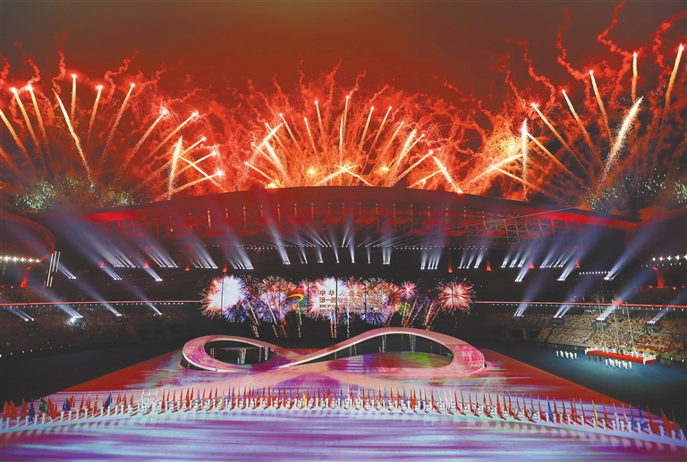 随后,主题为“在青春的赛道上”的文体展演拉开帷幕。文体展演包括《青春的山河》《青春的接力》《青春的奔跑》三个篇章和尾声《青春万岁》,将运动项目、体教元素、文艺元素与广西壮美山水、多彩民族、红色文化、开放发展等元素有机结合。尾声把绿色低碳的点火仪式与表演融合,并推出原创主题歌《以青春的名义》。