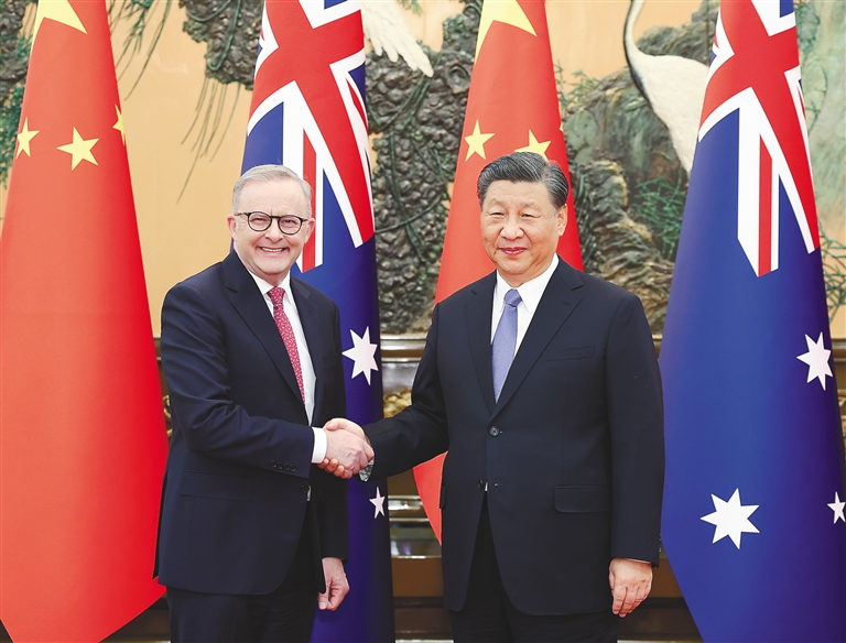 习近平强调,当前,世界经济不稳定、不确定、难预料因素增多,各国经济都面临不小挑战。面对复杂的外部环境,中国经济顶住了压力,稳定了规模,提升了质量,中国发展仍然具有良好支撑基础和诸多有利条件,中国将以自身稳定发展为不确定的世界经济带来宝贵的确定性。中国的发展离不开世界,世界的发展也需要中国。“小院高墙”“脱钩断链”,或者“去风险”,本质上都是保护主义,违背市场规律、科技发展规律,也违背人类社会发展潮流。中国奉行互利共赢的开放战略,推动构建新发展格局,以中国式现代化全面推进强国建设、民族复兴伟业,这将为包括澳大利亚在内的世界各国带来前所未有的机遇。中澳要在和平共处中增进相互理解和信任,在互利合作中实现共同发展。充分发挥中澳自由贸易协定潜能,拓展气候变化、绿色经济等新兴领域合作,维护全球和区域自由贸易体系,为两国企业投资经营提供良好营商环境。两国政府要支持立法机构、政党、智库、青年、地方开展交流,为人员往来创造更多便利条件,增进两国人民相知相亲,筑牢两国友好的民意基础。中国在亚太地区不搞排他性小圈子,不搞集团政治,不搞阵营对抗。小圈子解决不了全球面临的大挑战,小集团适应不了当今世界的大变局。对那些把亚太地区搞乱的企图,我们一是要警惕,二是要反对。中方愿同澳方开展更多三方、多方合作,支持南太平洋国家增强发展韧性,应对气候变化等挑战,在开放包容中维护亚太地区和平稳定。