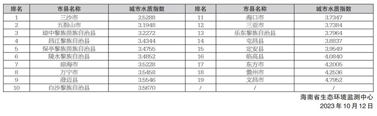 19个市县水环境质量按由好至差排名分别为:三沙市、五指山市、琼中黎族苗族自治县、昌江黎族自治县、保亭黎族苗族自治县、陵水黎族自治县、琼海市、万宁市、澄迈县、白沙黎族自治县、海口市、三亚市、乐东黎族自治县、屯昌县、定安县、临高县、东方市、儋州市、文昌市。详见右表: