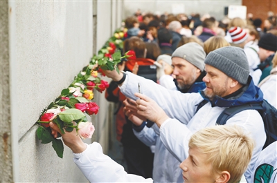 11月9日,在德国柏林,人们在柏林墙遗址上放置玫瑰花。