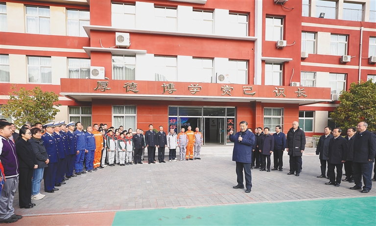 学校操场上,习近平亲切慰问了因公牺牲烈士家属和参与防汛抗洪救灾的基层党员干部群众、消防及应急救援人员、国企职工、志愿者代表等。习近平说,在这场抗洪抢险救灾斗争中,基层党员干部冲锋在前、勇于担当,人民解放军、武警部队官兵、消防救援队伍指战员挺身而出、向险前行,国有企业职工闻“汛”而动、紧急驰援,社会各界和志愿者积极参与、奉献爱心,书写了洪水无情人有情的人间大爱,展现了社会主义制度一方有难、八方支援的显著优势和全国人民万众一心、同舟共济的奋斗精神,涌现出许多感人故事。多名党员干部在抗洪抢险中牺牲,我们要永远怀念他们,大力宣扬他们的英勇事迹,有关方面要关心照顾好他们的家人。