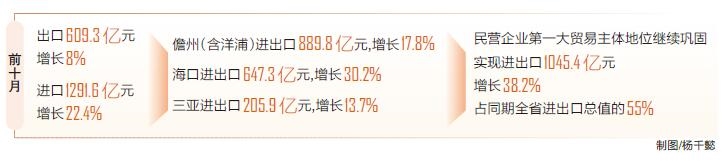 据海口海关相关负责人介绍,前10月,我省民营企业第一大贸易主体地位继续巩固,实现进出口1045.4亿元,增长38.2%,占比55%,继续保持全省第一大外贸主体地位;外商投资企业进出口478.4亿元,增长8.5%,占比25.2%;国有企业进出口376.9亿元,占比19.8%。