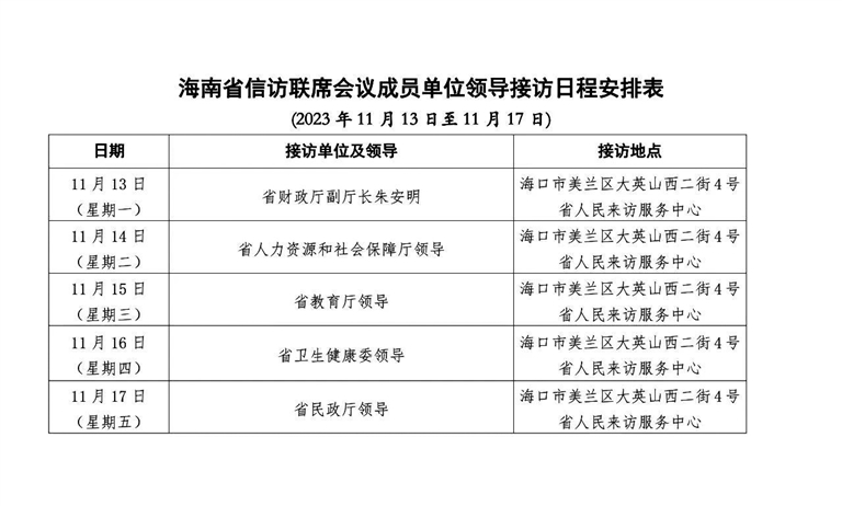 根据安排,省财政厅、省人力资源和社会保障厅、省教育厅、省卫生健康委、省民政厅相关负责人将分别于海南省海口市美兰区大英山西二街4号省人民来访服务中心接访群众。具体日程安排如下表。