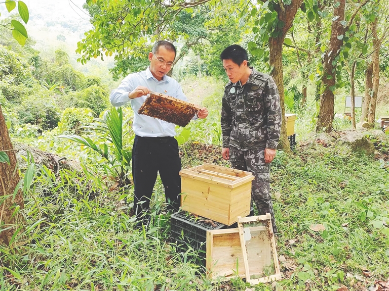 产业园的技术管理员朱志邵像往常一样前来查看蜂群采集情况并给予工人一些指导,“小时候在山上放牛时尝过野蜂蜜的味道,慢慢开始自己摸索养蜂技术,后来在中行驻村干部的帮扶下投身养蜂产业。”朱志邵是毛招村最早探索养蜂的村民,据他介绍,海南中行引导其到专业的养蜂基地跟班学习技术、升级本领,进一步增强了他通过养蜂增收致富的信心。