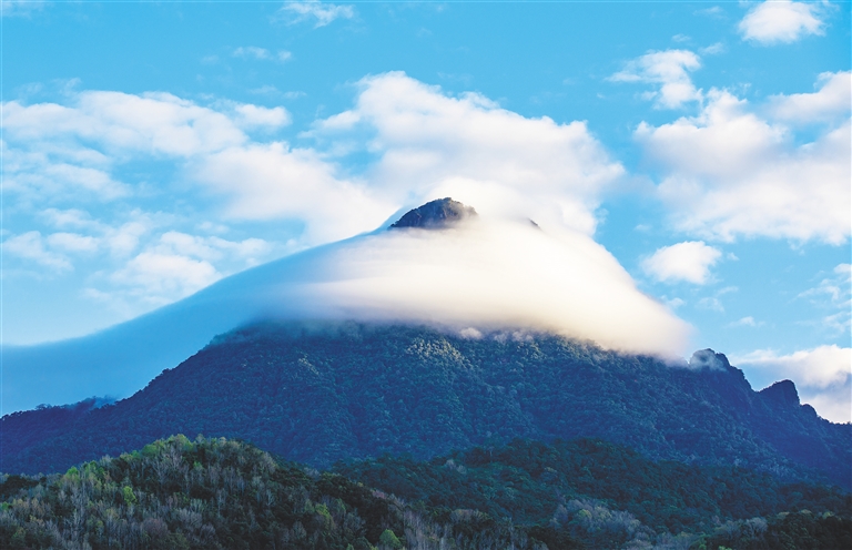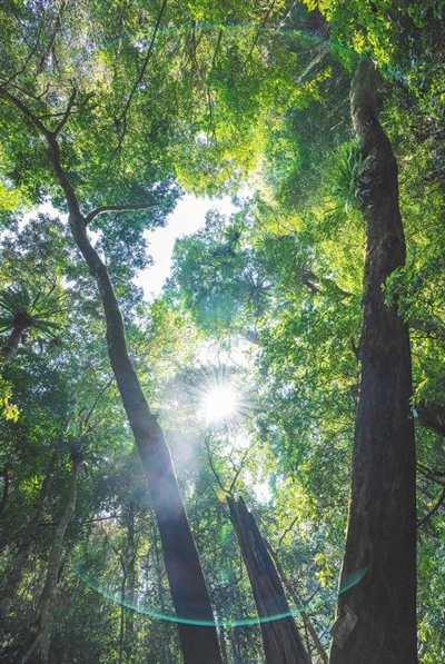 海南热带雨林国家公园位于海南岛中部,深入到热带雨林之中,在高处远眺,绿色铺满大地。我们没看见水,水却撑起一片绿意。覆盖雨林的绿色植物像一座大型工厂,数不胜数的叶片通过蒸腾作用,向大气中输送水蒸气。水蒸气凝结成云朵,有时布满天空,有时萦绕山头。云朵肆意变换着形状,玩弄起光影,光也有了形状,这时“丁达尔效应”就出现了。