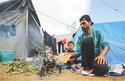 这是11月14日在加沙地带南部城市汗尤尼斯一个临时营地拍摄的流离失所的巴勒斯坦人。
