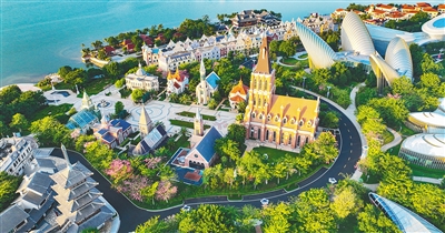 这次新获评国家级旅游休闲街区的儋州市环海艺术美食街区,位于儋州海花岛度假区,这里融汇了明清、苏州、川西、岭南、东南亚、德国柏林、日本京都、法国等10余种特色风情建筑,囊括风情饮食街、风情商业街、茗茶酒吧街、珍奇特色植物园、婚礼庄园、博物馆六大业态,占地近2万平方米的婚礼庄园拥有9栋古典殿堂,吸引了超过一万对新人在这里留下幸福的瞬间。