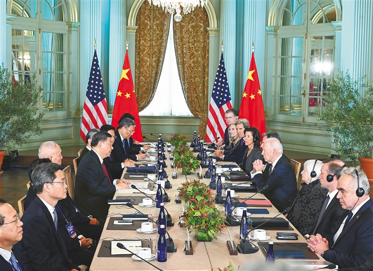 这次会晤积极、全面、富有建设性,为改善和发展中美关系指明了方向。旧金山应该成为稳定中美关系的新起点。两国元首责成双方团队在落实好巴厘岛会晤共识基础上,及时跟进和落实本次会晤达成的新愿景。两国元首同意继续保持经常性联系。