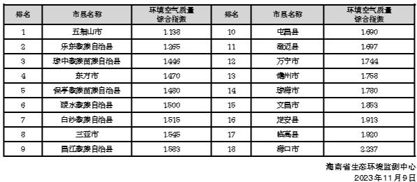 环境空气质量排名靠前的市县分别是五指山市、乐东黎族自治县和琼中黎族苗族自治县,排名靠后的市县分别是海口市、临高县和定安县。2023年10月全省18个市县环境空气质量排名如右表: