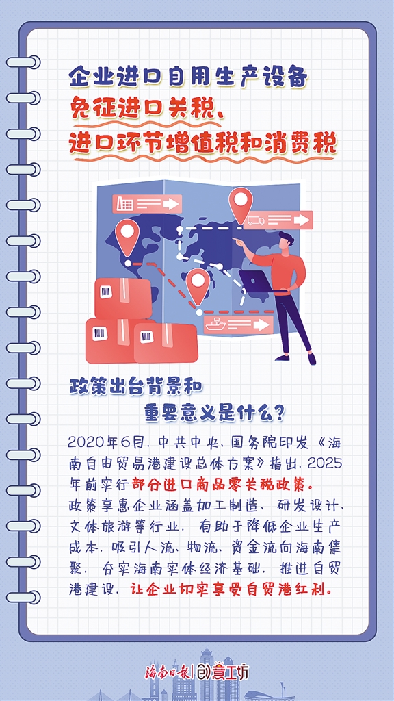 2021年2月,财政部、海关总署、税务总局印发《关于海南自由贸易港自用生产设备“零关税”政策的通知》(财关税〔2021〕7号),明确全岛封关运作前,对海南自由贸易港注册登记并具有独立法人资格的企业进口自用的生产设备,除法律法规明确不予免税外,免征进口关税、进口环节增值税和消费税。2022年2月,财政部、海关总署、税务总局印发《关于调整海南自由贸易港自用生产设备“零关税”政策的通知》(财关税〔2022〕4号),新增列过山车等8项文体旅游业所需的生产设备,并将政策适用主体扩大至事业单位。