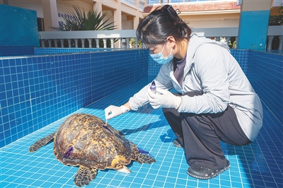 海龟运抵保护中心后,工作人员和海南师范大学博士张婷立即对海龟的健康状况进行检查。“绿海龟的后鳍无力,要让它在这静养。”“太平洋丽龟有伤口,要做伤口处理。”检查完毕,大家一起对两只海龟进行治疗,并放入盛满清澈海水的养殖池内。