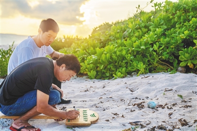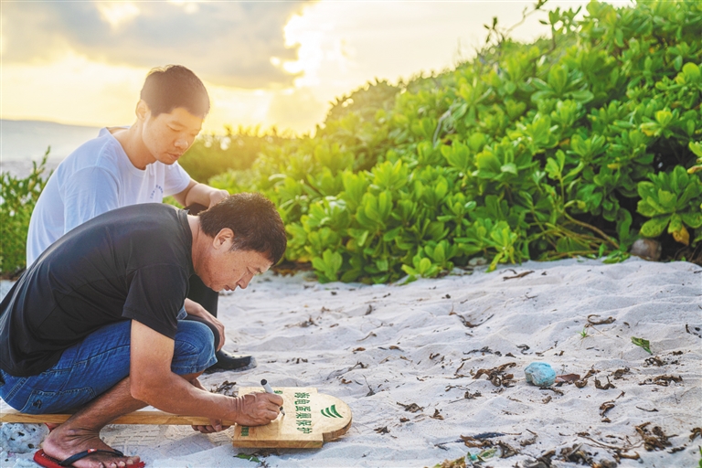 现在的黄锐,每天清晨都要沿着北岛海岸线巡逻。在此期间,他敏锐地捕捉在夜间上岸产卵雌龟的行进轨迹,第一时间找到产卵点,并竖起指示牌加以保护。“写上编号、备注时间,再立好牌子”。据统计,今年以来,三沙共开展海龟巡护215次。