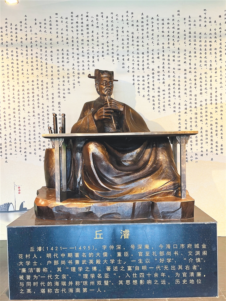 笔力惊人的丘濬不仅写海南的山水,也写海南的风物。他写咏物诗细致生动,善用比拟,描述椰子、荔枝等实物信口拈来如在眼前,又不落窠臼、寓意深刻。比如他的一首写椰子树的诗《椰林挺秀》就颇为有名:“千树榔椰食素封,穹林遥望碧重重。腾空直上龙腰细,映日轻摇凤尾松。山雨来时青霭合,火云张处翠荫浓,醉来笑吸琼浆味,不数仙家五粒松。”诗人以远景描写开篇,接着以“龙腰细”“凤尾松”等勾勒椰树的局部特征,远近结合,最后点出椰树为人们带来浓荫和琼浆,传递出“此物只应天上有”的赞美之意。短短几句诗,反映出诗人观察生活之细致和超强的文字功底。