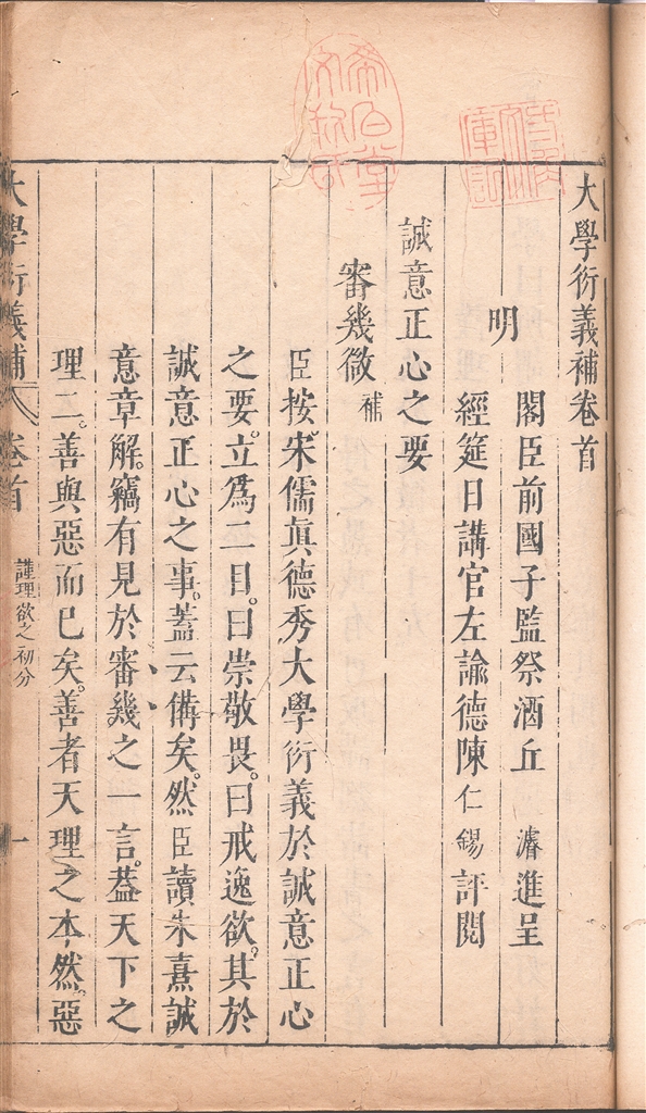 幸运的是,弘治皇帝对此书非常认可。丘濬于成化二十三年十一月十八日进书,年关一过即弘治元年正月二十二日皇帝即下谕旨:“览卿所纂书,考据精详,论述赅博,有补于政治,朕甚嘉之。”并下令发福建书坊刊刻。或许是此书带来了好运,此后数年丘濬接连升迁:由礼部侍郎兼国子监祭酒升任礼部尚书、署詹事府事;进太子太保兼文渊阁大学士,直阁预机务;再进少保兼户部尚书、武英殿大学士,位极人臣,成为真正的“帝王师”。丘濬入阁时已是暮年,且患疾病,但仍悉心辅主,成为弘治皇帝最信任之人。