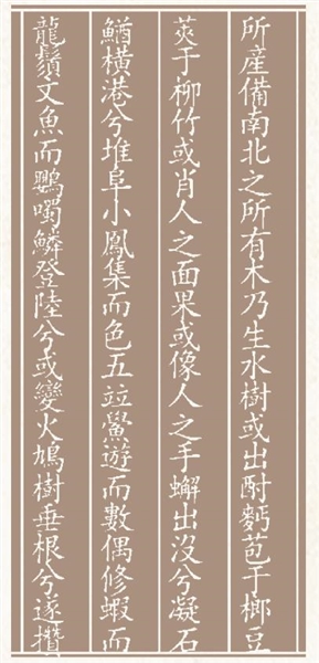《南溟奇甸赋》正文3000多字,可归于传统大赋之列。传统大赋的体式、表现方法与风格,自西汉枚乘的《七发》开创、司马相如的《子虚赋》《上林赋》确立之后,就无人可以超越。那时,大赋相较屈原的《楚辞》、荀子的《赋篇》,被称为“新体赋”或“散体大赋”,篇幅长、散文化、主客问答及卒章显志是其基本格局。枚乘在《七发》里说的“比物属事,离辞连类”,是大赋主要的写作方法。这一方法因《诗经》的艺术方法赋、比、兴之“赋”而生,但较之《诗经》之赋的铺陈,大赋铺陈闳富有气势,语言华美缛丽。丘濬的《南溟奇甸赋》具有传统大赋的特征。赋经历了两晋南北朝骈文的影响,一些赋的作者追求赋的骈化,如南朝江淹的《恨赋》《别赋》,晚唐杜牧的《阿房宫赋》等,使骈赋成为赋的重要门类。丘濬所处时代较晚,受骈文、骈赋的影响,他的《南溟奇甸赋》在语言上运用了骈散相兼的形式,而不是纯散文化。