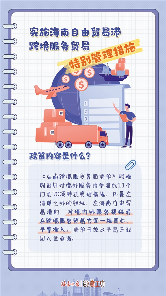 《海南自由贸易港建设总体方案》提出,实施跨境服务贸易负面清单制度,除跨境交付、境外消费、自然人移动等服务贸易模式下存在的各种壁垒,给予境外服务提供者国民待遇。实施与跨境服务贸易配套的资金支付与转移制度。在告知、资格要求、技术标准、透明度、监管一致性等方面,进一步规范影响服务贸易自由便利的国内规制。减少跨境服务贸易限制。在重点领域率先规范影响服务贸易自由便利的国内规制。制定出台海南自由贸易港跨境服务贸易负面清单,给予境外服务提供者国民待遇。2021年7月,经党中央、国务院同意,商务部印发《海南自由贸易港跨境服务贸易特别管理措施(负面清单)(2021年版)》(以下简称《海南跨境服贸负面清单》),这是我国在跨境服务贸易领域公布的第一张负面清单。