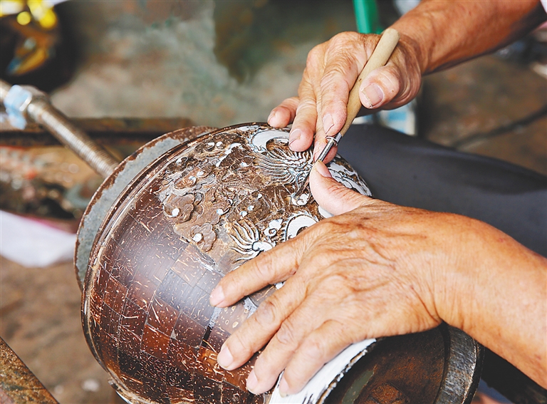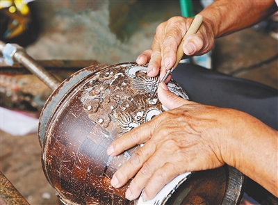 传统手工椰雕制作工艺十分复杂,一件成型的椰雕工艺品要经过选料、造模、雕刻、通花、镶嵌、抛光、修饰等多道工序。柯秋枫介绍,这每道工序都马虎不得,必须全神贯注,稍有不慎刻刀就会跑偏,划破手掌或胳膊,和椰雕打交道多年,他的身上也留下了不少伤痕。