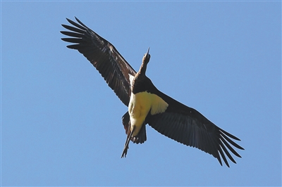 “从当时拍摄的画面可以看到,一只黑鹳时而展翅高飞,时而在空中盘旋,最后落在了一个通信塔架上休息。”薛美丽说,随着镜头推进,可以看出这只黑鹳头、颈和脊背均呈黑褐色,上体羽毛黑色、胸腹部羽毛白色。