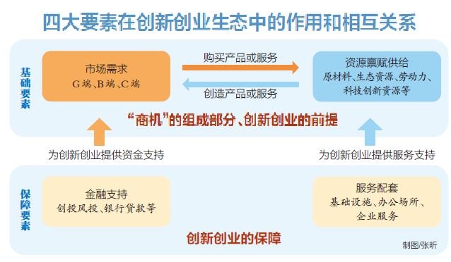 经长期跟踪调研发现,一个地区创新创业得以蓬勃发展,除了创业者自身的才能外,还需要有一套健全有机的生态体系,本文称之为“创新创业生态”,其至少应包含市场需求、资源禀赋供给、金融支持、服务配套四大要素。四大要素在创新创业生态中的作用和相互关系如下: