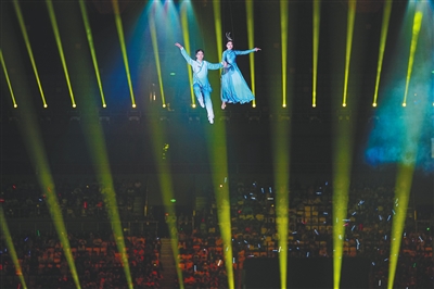 光影变幻,开场舞上,两名演员借助威亚索道在空中飞舞,与地面投影一起,共同营造出“你我共乘海浪之上”的美学意境。“内心很激动,能够和大家相聚三亚,参与和见证这场盛会。”参演人员王应政说。