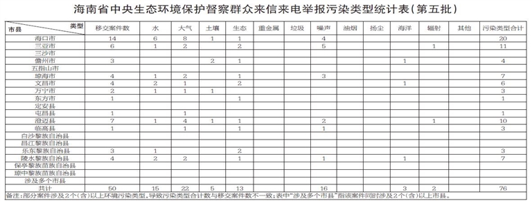 从污染类型来看,第五批50件群众信访举报件中,涉及大气污染问题22件、噪声污染问题16件、水污染问题15件、生态污染问题13件、土壤污染问题5件、海洋污染问题3件、辐射问题2件。