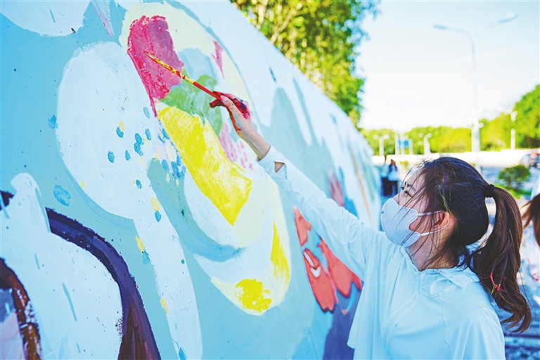 11月24日,三亚学院视觉传达设计专业学生在三亚市学院路,对街边200余米的墙体进行绘画创作。