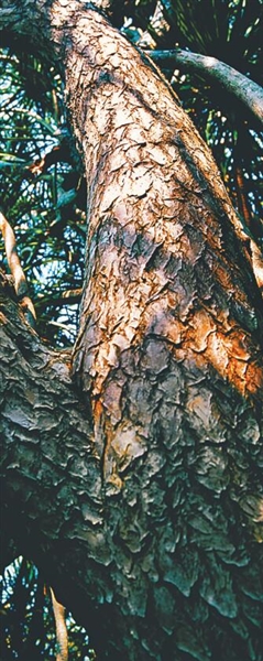 郑兵介绍,人们常说的“福如东海长流水,寿比南山不老松”,“不老松”就是龙血树。凑近仔细观察,龙血树的茎干肤色灰青,斑驳栉比状如龙鳞。而一旦受伤,则会流出暗红色的树脂,像流血一样,龙血树因而得名。