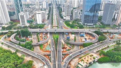 11月26日,俯瞰海口滨海立交改造项目现场。目前该项目正在进行桥梁桩基、承台、墩台工程施工。