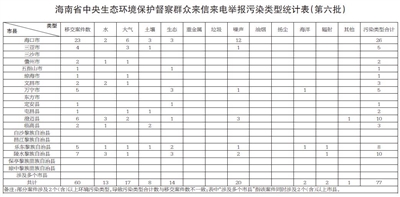 从污染类型来看,第六批60件群众信访举报件中,涉及噪声污染问题20件、大气污染问题17件、生态污染问题14件、水污染问题13件、土壤污染问题8件、海洋污染问题和辐射问题各2件,以及其他问题1件。