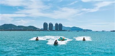近日,在三亚湾海月广场附近海域,来自成都的“95后”情侣张茂和李琳坐了一回“海上超跑”,快速而刺激的感受让他们直呼过瘾。“海上超跑”是三亚湾滨海水运动乐园的一款体验项目,好比在海上“开跑车”,吸引着许多年轻人来体验。